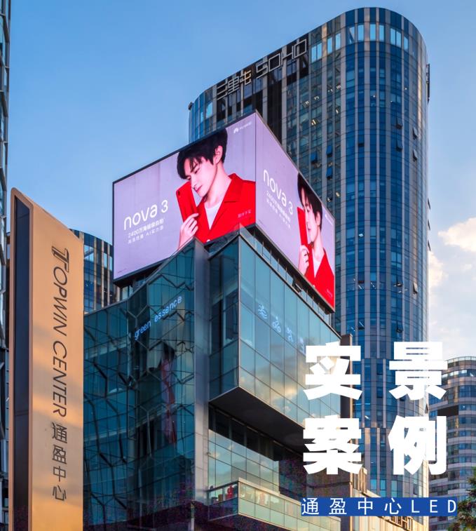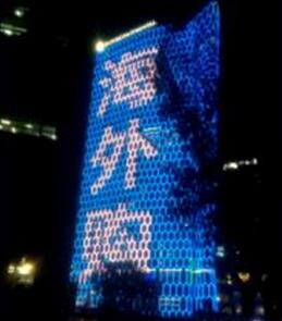 | 北京三里屯通盈中心: 樓頂展示面為東、西向,畫面同步播放。 樓體幅寬80米,高150米,為三里屯地區第一高樓。 最大程度影響工體北路、二環、三環、三里屯商圈人群 |