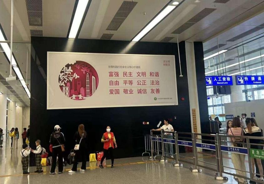 覆蓋深圳前往香港、國外的出境旅客,跨境學童等候區。私家車、出租車落客區,去衛生間必經,與旅客距離近,有視覺沖擊。