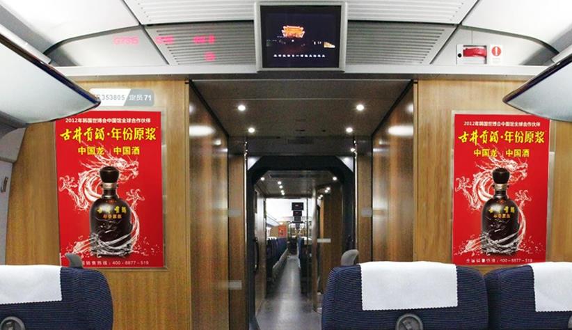 屬于聽覺強化媒體,在安靜舒適的封閉式環境內視覺、聽覺的多種媒體協調配合的特點。 用于整個列車的廣告冠名,可以根據客戶需求定制廣告語。