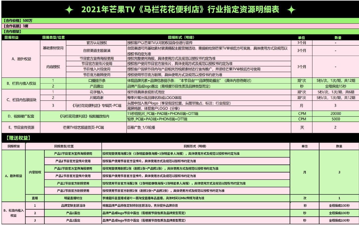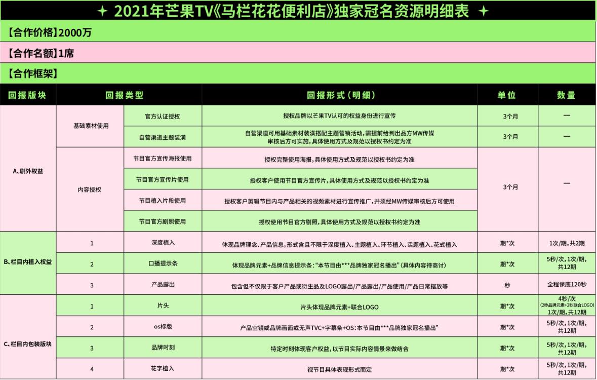 2021年芒果TV《馬欄花花便利店》獨(dú)家冠名資源明細(xì)表