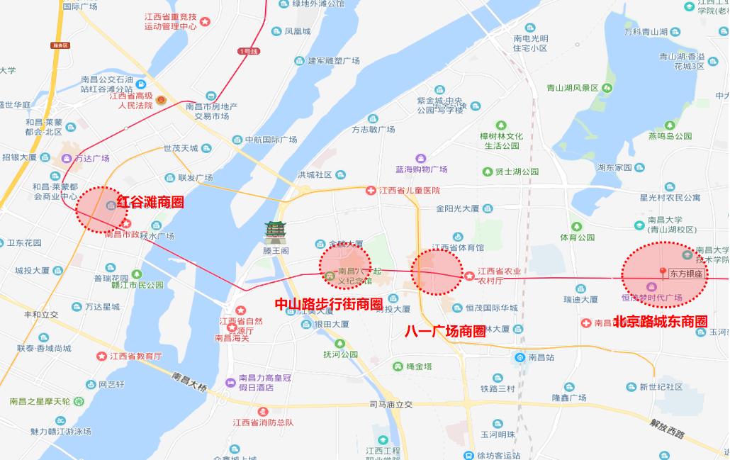 聚集高檔寫字樓、頂級公寓、萬壽宮、金童女人城、新巢韓國女人城、 動壹美食基地、老字號黃慶仁、八一起義紀念館等辦公、購物、旅游 于一體。