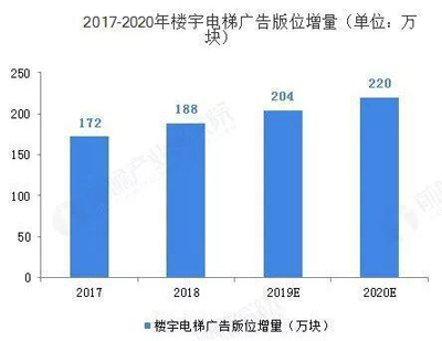 談到電梯廣告,那么就不得不談到中國的電梯行業(yè)。近年來我國房地產(chǎn)行業(yè)的高層建筑投資比例在增加,加速了電梯的需求量。中國電梯需求從2011年的37萬臺提升至2018年的94萬臺,預(yù)計2020年我國 電梯需求量將在110萬臺左右。電梯樓宇框架的增量空間在于國內(nèi)電梯需求量的增長,一般而言進行廣告投放的電梯每部安置2塊,剔除不適合投放的電梯部數(shù),2017-2020 年樓宇電梯廣告版位的增量分別約為 172、188、204、220 萬塊,每年同比增速在 8-9%之間。