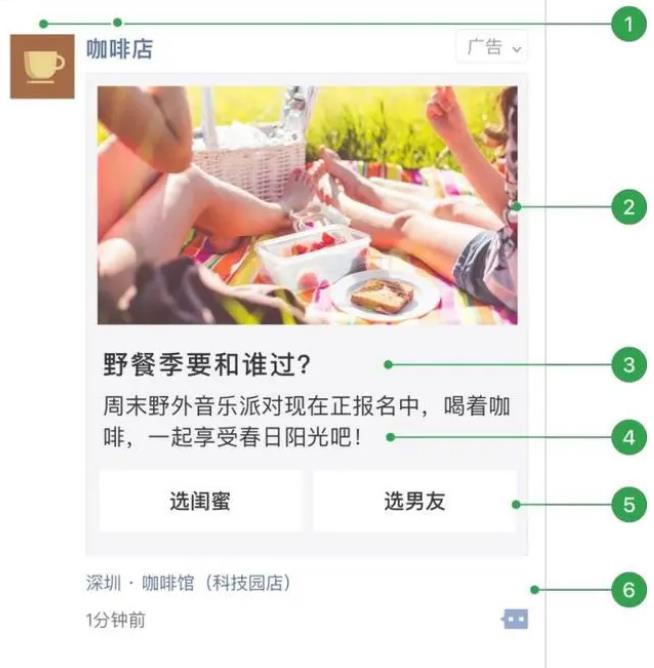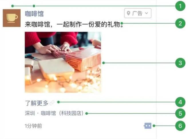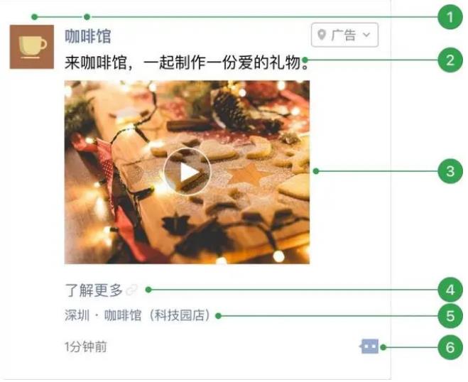 2. 外層圖片、小視頻;3. 外層文案標題(可選);4.外層文案詳情;5.門店標識(有線下門店可選擇展示);6.用戶社交互動。