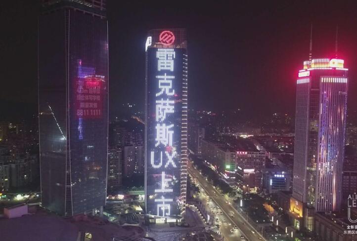 城市地標燈光秀廣告,廣東東莞民盈國貿中心樓體燈光秀廣告