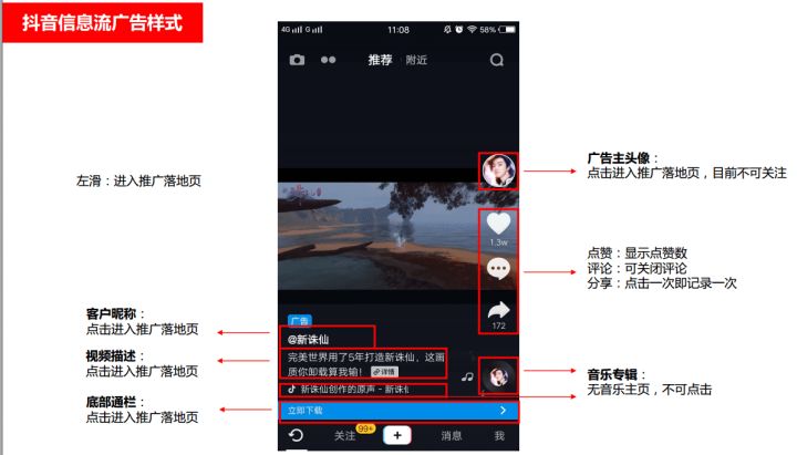 出現(xiàn)在抖音APP推薦頻道上滑第四位,廣告時長為5s-30s,每個用戶每天最多看1條廣告;每條廣告對每個用戶只展示1次,同一素材最多只能投放1天,不支持各種形式的同一素材重復(fù)投放。