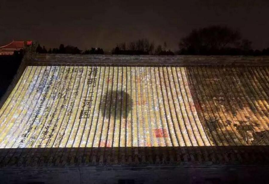 此次夜游故宮最精彩的地方,莫過于從東北角樓帶神武門的這一塊區(qū)域了。光與影將《清明上河圖》和《千里江山圖》等畫卷投影于大殿屋頂上,或如展開的折扇,或如綠色的屏障,耳邊還應(yīng)景地回蕩著叫賣、搖櫓等聲音,古畫的意境與屋瓦融為一體,靈動(dòng)異常,仿佛人在畫中游。