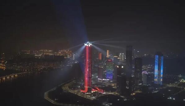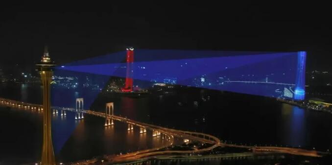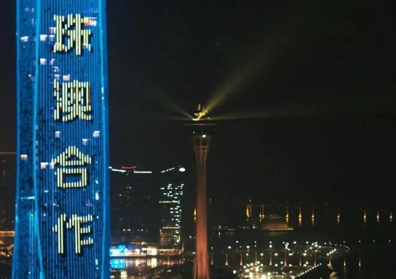 當晚,珠澳兩地三座地標建筑——330米的珠海中心大廈、339米的橫琴國際金融中心(橫琴IFC)和338米的澳門觀光塔(澳門塔)變身“城市燈塔”,通過樓頂的激光和燈光裝置,在濠江江面共同獻上了一場流光盛宴。