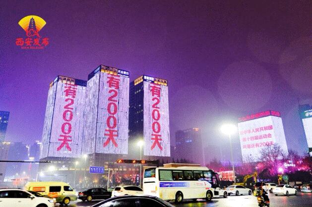 在環城公園美景后面的西安城墻輪廓,被燈光勾勒出來。西南城角更是被璀璨的燈光照亮,“距中華人民共和國第十四屆運動會開幕還有200天”等字樣,顯示在古老的西安城墻上。