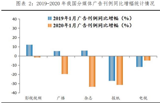 目前,分媒體來看,傳統(tǒng)廣告媒介主要包括影視媒體、報紙媒體、雜志、廣播和電視等。2020年1月,報紙、雜志、廣播等較為傳統(tǒng)的廣告媒介刊例下降幅度較大,報紙、雜志等紙媒下降了將近30%以上,廣播媒介與電視下降了19.5%和4.9%。整體而言,傳統(tǒng)媒體廣告刊例花費(fèi)呈下降趨勢,報紙、雜志等紙媒首當(dāng)其沖,其次廣播媒介,最后電視及影視媒介。