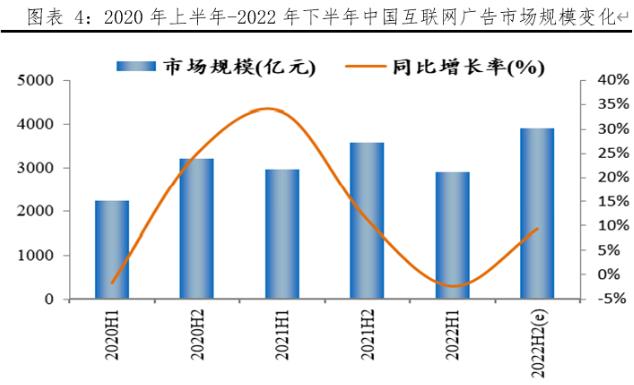 8月2日QuestMobile發(fā)布《2022互聯(lián)網(wǎng)廣告市場半年大報告》顯示(圖表4),2020年上半年-2022年下半年中國互聯(lián)網(wǎng)廣告市場規(guī)模波動變化明顯,今年上半年中國互聯(lián)網(wǎng)廣告市場規(guī)模為2903.6億元,同比降低2.3%。一般下半年廣告規(guī)模呈良好態(tài)勢,整體來看2022年下半年互聯(lián)網(wǎng)廣告市場規(guī)模略有增加,同比增長9.4%。