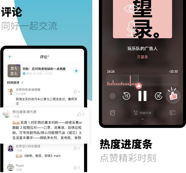 界面特別清新,比其它APP界面簡潔,可以根據(jù)聽到哪一段進(jìn)行評論,評論區(qū)有很多令人感同身受的觀點(diǎn)。 —— 南城以南溫暖如初 統(tǒng)計(jì)收聽時(shí)長這個(gè)功能最滿意。