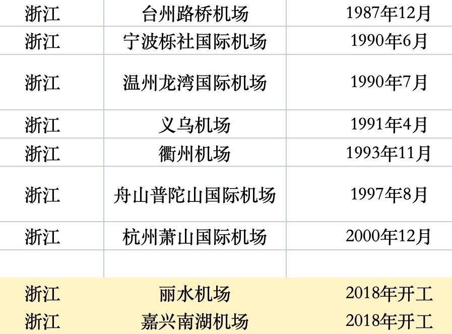 從機場建成通航的時間來看,上世紀90年代是高峰期。如在浙江的7個機場中,有5個于90年代通航,另有杭州蕭山國際機場在2000年12月通航。